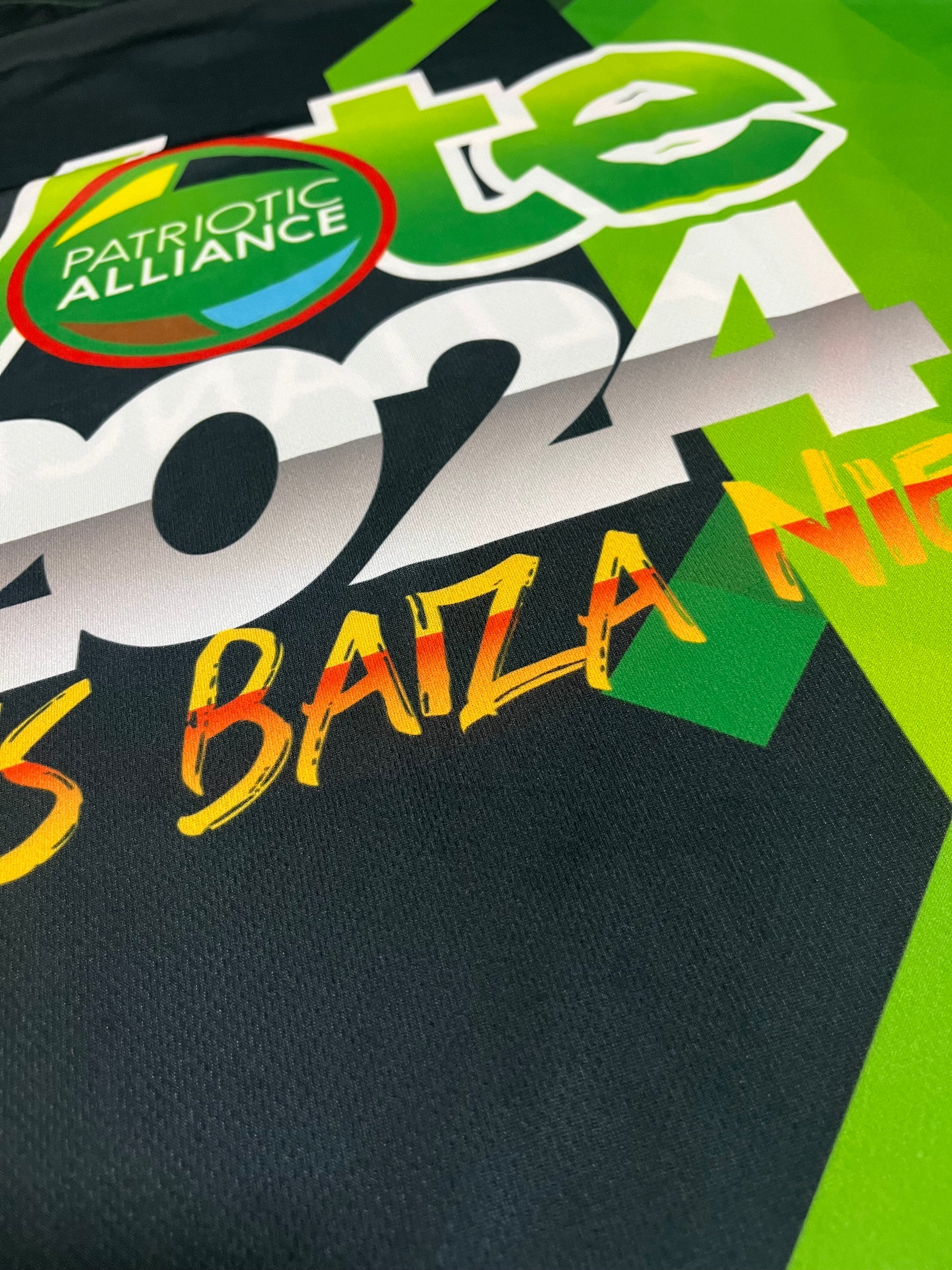 Patriotic Alliance long sleeve T-shirt with green and black abstract design, '#abahambe' and 'ons baiza nie' on sleeves, made from birds eye material.